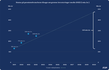 Danskernes store pensionsformue bidrager i høj grad til at sikre den grønne omstilling i Danmark ved de mange klimavenlige investeringer. I 2019 gav den danske pensionsbranche som den første i verden et tilsagn om at investere yderligere 350 mia. kr. i grøn omstilling inden for bæredygtig energi, fx vind og sol.