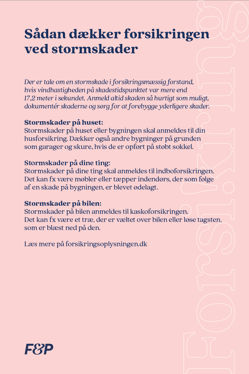 - Når det blæser over 17,2 meter i sekundet er der i forsikringsmæssig forstand tale om en storm, og forsikringen vil dække stormskaderne. På Forsikringsvejret.dk kan du indtaste din adresse og se, om det blæste så meget på skadestidspunktet hos dig, at der er tale om storm,” sige Anne Garde Slothuus.
